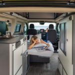 Ein Garderöbchen mit fünf Kleiderhaken und ebenso viele USB-Anschlüsse sind in der kleinen Kombüse untergebracht, zu den aufmerksamen Details zählen auch die beiden LED-Spots in der Heckklappe oder ein kleines Gewürzregal in der Küche. Die 2,8-Liter-Gasflasche zum Kochen ist so griffgünstig platziert, dass sie sich von der Sitzbank aus in Sekundenschnelle wechseln, auf- oder zudrehen lässt. Und der Küchenblock enthält keine Toplader-Kühlbox, sondern einen richtigen kleinen Kühlschrank, der auch von draußen gut erreichbar ist.