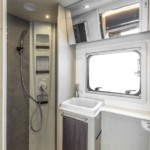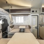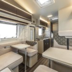Gespeist wird an einer Dinette. Eine zweite Sitzgruppe erweitert das Platzangebot und erhöht den Wohnkomfort. Sowohl die Küche als auch der Kühlschrank mit einem Fassungsvolumen von 89 Liter finden auf der Beifahrerseite ihren Platz. Außerdem besitzt das Fahrzeug auf der Fahrerseite ein Bad mit feststehender Duschkabine. Für einen erholsamen Schlaf sorgen die Stockbetten im Heck.